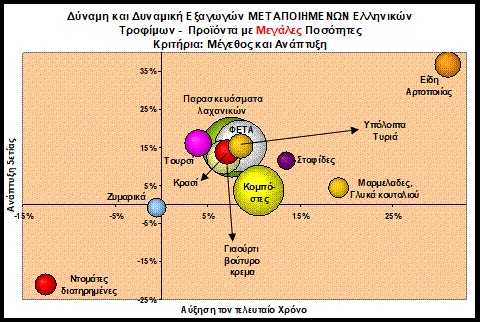 Τα κλασικά εξαγόμενα ελληνικά μεταποιημένα τρόφιμα είναι τα παρασκευάσματα λαχανικών, η φέτα και οι κομπόστες, όλα σε καλή ανάπτυξη. Αυτό το προϊόν που ξεχωρίζει όμως και αναπτύσσει τις εξαγωγές του με πολύ μεγάλο ρυθμό είναι τα είδη αρτοποιίας και ζαχαροπλαστικής. Και τα υπόλοιπα προϊόντα όμως, από εκείνα που δεν κάνουν μεγάλες ποσότητες, σημειώνουν καλή ανάπτυξη, όπως οι μαρμελάδες και τα γλυκά κουταλιού, το κρασί, τα υπόλοιπα τυριά και τα τουρσί. Αρνητική ανάπτυξη σημειώνουν οι διατηρημένες ντομάτες και μηδενική τα ζυμαρικά.