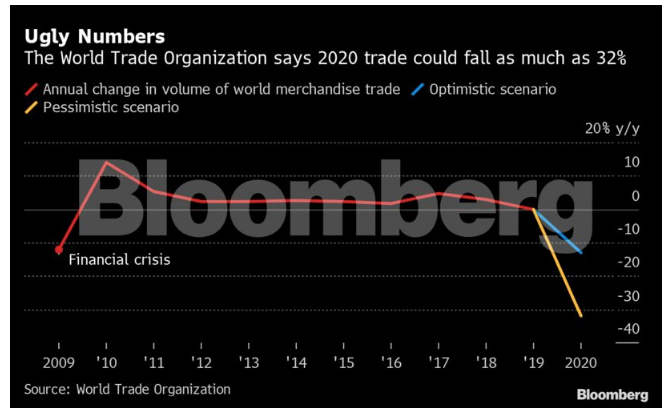 Με βάση το αισιόδοξο σενάριο του ΠΟΕ, η πτώση του όγκου του παγκόσμιου εμπορίου αγαθών το 2020 θα αγγίξει το 13%. Η τελευταία ανάλογη πτώση κατεγράφη το 2009, συγκεκριμένα κατά 12%, ως απότοκο της παγκόσμιας χρηματοοικονομικής κρίσης. Στο απαισιόδοξο σενάριο, η πτώση μπορεί να αγγίξει έως και το 32%.