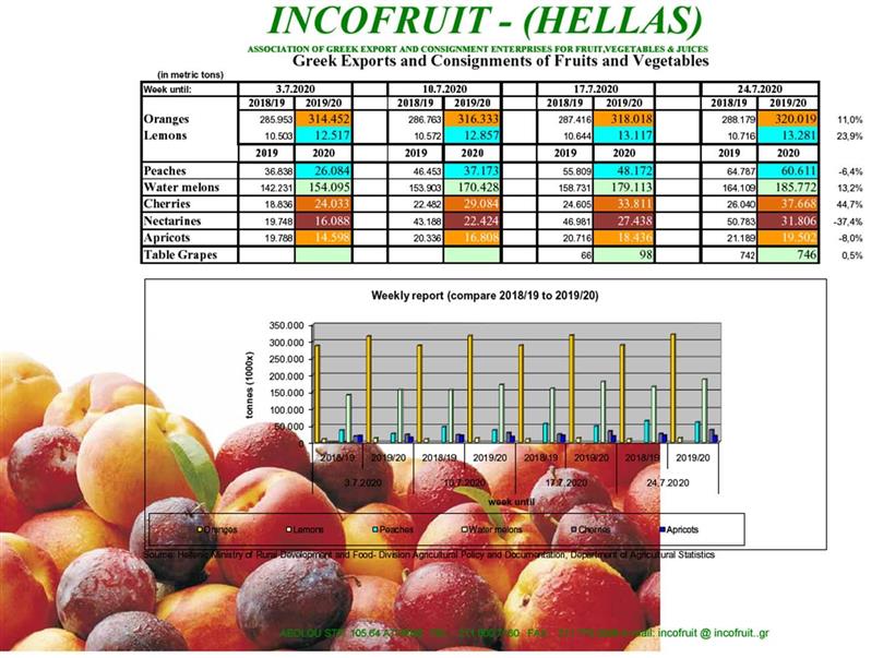 Οι εξαγωγές ροδακίνων είναι ελαφρώς μειωμένες κατά -6,4% έναντι πέρσυ με την εμπορεύσιμη παραγωγή στα ίδια με πέρσυ επίπεδα και την ποιότητα και τιμές σε ικανοποιητικά επίπεδα και με την εκτίμηση ότι θα βελτιωθούν σε θετικό πρόσημο το επόμενο 10ημερο Επίσης οι εξαγωγές των νεκταρινιών παρουσιάζουν ζήτηση και η εμφανιζόμενη μείωση οφείλεται σε οψίψηση της συγκομιδής Οι εξαγωγές των βερικόκκων ουσιαστικώς περαιώθησαν με -8% σε 19.502.έναντι 21.189 τόνους , λόγω μειωμένης παραγωγής