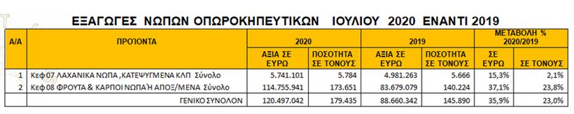 Η αύξηση τον Ιούλιο κατά 35,9% διαμόρφωσε τις συνολικές εξαγωγές νωπών Οπωροκηπευτικών αυξημένες κατά 23,1% σε αξία & κατά 12,2% σε όγκο την περίοδο Ιανουαρίου–Ιουλίου 2020 έναντι 2019