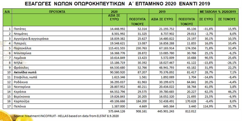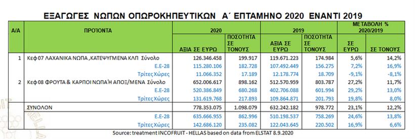 Οι εξαγωγές των νωπών φρούτων και λαχανικών, σε συνέχεια του έτους ρεκόρ όλων των εποχών 2019, κατά την περίοδο Ιανουαρίου-Ιουλίου αυξήθηκαν κατά 23,1% σε σύγκριση με την ίδια περίοδο του 2019, παρά τις επιπτώσεις του νέου τύπου επιδημίας κορωναϊού (covid-19), φθάνοντας τα 778,4 εκατομμύρια ευρώ και 1.098 χιλιάδες τόνους.