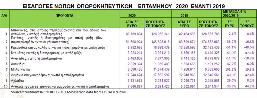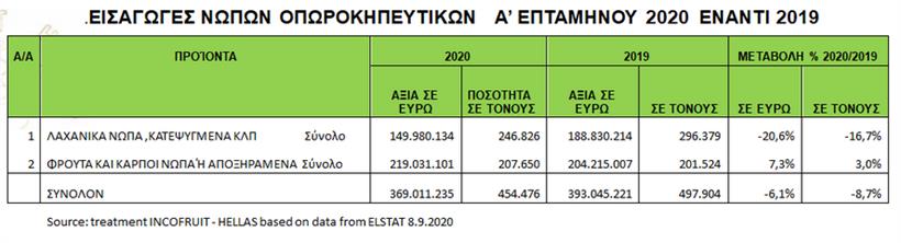 Παράλληλα υπήρξε μείωση των εισαγωγών το αντίστοιχο επτάμηνο στην χώρα μας, κατά -8,7% σε όγκο ,με σημαντική την μείωση εισαγωγών κυρίως σε λαχανικά -16,7% κατ όγκο και κατά -20,6% σε αξία