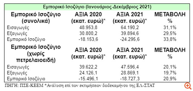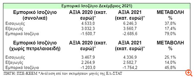 Σύμφωνα με ανάλυση του Πανελληνίου Συνδέσμου Εξαγωγέων και του Κέντρου Εξαγωγικών Ερευνών και Μελετών (ΚΕΕΜ), επί των προσωρινών στοιχείων της ΕΛ-ΣΤΑΤ, τον Δεκέμβριο του 2021 μεγάλη άνοδο καταγράφουν τόσο οι εξαγωγές, καθώς αυξήθηκαν κατά 17,4%, όσο και οι εξαγωγές, οι οποίες αυξήθηκαν κατά 37,8%. Ως εκ τούτου, το εμπορικό έλλειμμα αυξήθηκε κατά 79%.