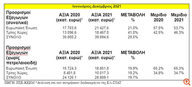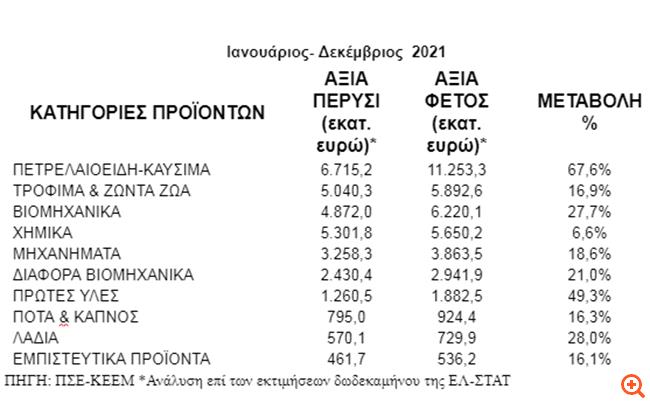 Ομοίως, χωρίς τα πετρελαιοειδή, είναι αξιοσημείωτο ότι παρά την πανδημία και τις επιπτώσεις της, οι εξαγωγές για το δωδεκάμηνο Ιανουαρίου-Δεκεμβρίου κινούνται ανοδικά σε σχέση με το 2020, στα 28,87 δισ. ευρώ από 24,13 δισ. ευρώ, δηλαδή αυξημένες κατά 4,74 δισ. ευρώ ή κατά 19,7%.