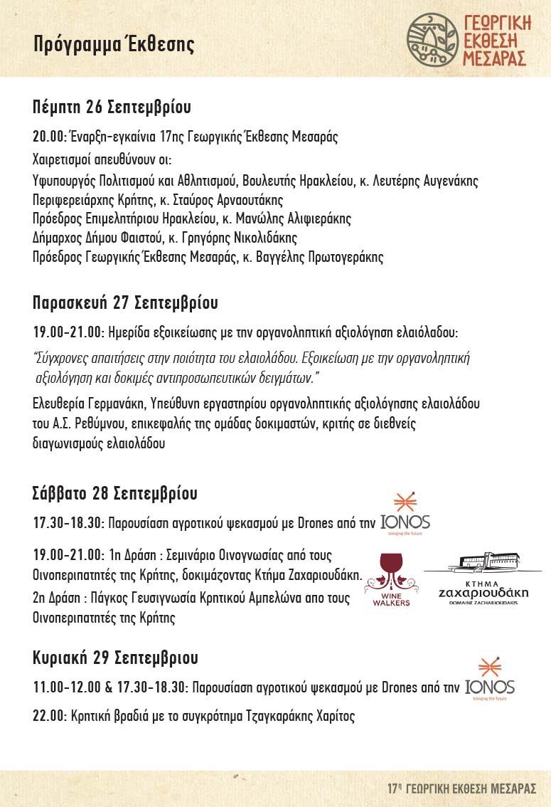 Ολοκληρώθηκαν οι προετοιμασίες για την 17η Γεωργική Έκθεση Μεσαράς, η οποία ανοίγει τις πύλες της σήμερα Πέμπτη 26 Σεπτεμβρίου και θα διαρκέσει έως την Κυριακή 29 Σεπτεμβρίου 2019 στο Εκθεσιακό Κέντρο στους Βώρους του Δήμου Φαιστού. Το ωράριο λειτουργίας της Έκθεσης είναι από Πέμπτη έως Σάββατο 17.00-22.00 και την Κυριακή 10.00-14.00 και 17.00-22.00.