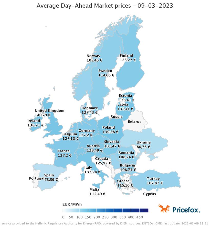 Τη μεγαλύτερη μείωση τιμής αυτό τον μήνα σε σχέση με το ετήσιο μέσο όρο παρουσιάζει η Τουρκία αφού τον Μάρτιο αγοράζει την MWh στα €115,47 έναντι του €149,93, δηλαδή €34.46 λιγοτερα. Αντίθετα τη μεγαλύτερη αύξηση την παρουσιάζουν η Ισπανία και η Πορτογαλία οι οποίες τον Μάρτιο πληρώνουν την MWh €24,62 και €30,78 ακριβότερα από ό,τι τον υπόλοιπο χρόνο, κατά μέσο όρο.