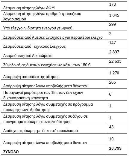 • Οι υπόλοιπες κατηγορίες, που αφορούν συνολικά σε 28.799 μοναδικά ΑΦΜ και που δε συμπεριλήφθηκαν και αυτά στην πληρωμή είναι: