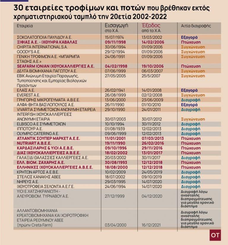 Είτε μέσω εξαγορών (απορρόφηση από μη εισηγμένη και διαγραφή λόγω δημόσιας πρότασης) και συγχωνεύσεων (απορρόφηση από άλλη εισηγμένη με τελική κατάληξη τη διαγραφή) είτε μέσω delisting με απόφαση του βασικού μετόχου ή λόγω κανονισμού (χαμηλή παραγωγική δραστηριότητα) είτε εξαιτίας πτώχευσης (οικονομικά προβλήματα που οδήγησαν στη διαγραφή), οι μετοχές του κλάδου των τροφίμων και ποτών έχουν αποδεκατιστεί.