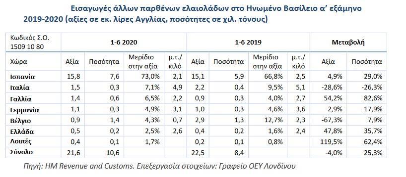 Ειδικότερα, σύμφωνα με την ελληνική Πρεσβεία στο Λονδίνο, ο μέσος ετήσιος ρυθμός αύξησης της αξίας των εισαγωγών ελαιολάδου (κωδικός συνδυασμένης ονοματολογίας 1509) ήταν1,8% την τελευταία πενταετία, ενώ αρνητική πορεία -9% το χρόνο καταγράφεται σε επίπεδο τριετίας, οφειλόμενη τόσο στη μείωση των εισαγωγών μεταξύ 2017 και 2018, όσο και στη μείωση της τιμής του προϊόντος μεταξύ 2018 και 2019.
