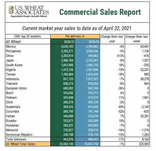 Παράλληλα την εβδομάδα 8-14 Απριλίου 2021 σημειώθηκε μείωση της τάξεως του 7% στις καθαρές πωλήσεις σε σχέση με την εβδομάδα (15-21 Απριλίου 2021). Πιο συγκεκριμένα, οι πωλήσεις αυτή την εβδομάδα έφτασαν τις 223.600 ΜΤ (μετρικούς τόνους), ενώ την περασμένη είχαν ανέλθει στους 240.000 ΜΤ. Ενδεικτικά, αυξήθηκαν οι πωλήσεις σιταριού σε κράτη όπως το Μεξικό, η Νιγηρία, η Ινδονησία και τα Ηνωμένα Αραβικά Εμιράτα, ενώ μειώθηκαν σε Ν. Κορέα, Γουατεμάλα και Μαλαισία.