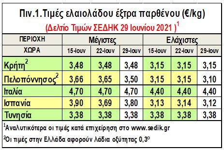 Αυξητικά κινούνται οι τιμές ελαιόλαδου στην Ισπανία, ενώ μια σταθερότητα παρατηρείται σε αυτές της Ελλάδας και της Ιταλίας, σύμφωνα με το δελτίο τιμών του ΣΕΔΗΚ της 29ης Ιουνίου 2021.