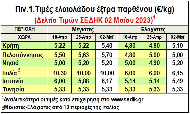 Σύμφωνα με το Δελτίο τιμών του ΣΕΔΗΚ της 02 Μαΐου 2023, οι τιμές του έξτρα παρθένου στις κύριες ελαιοπαραγωγικές χώρες διαμορφώνονται ως εξής: