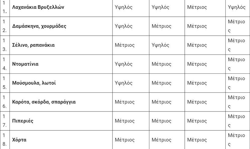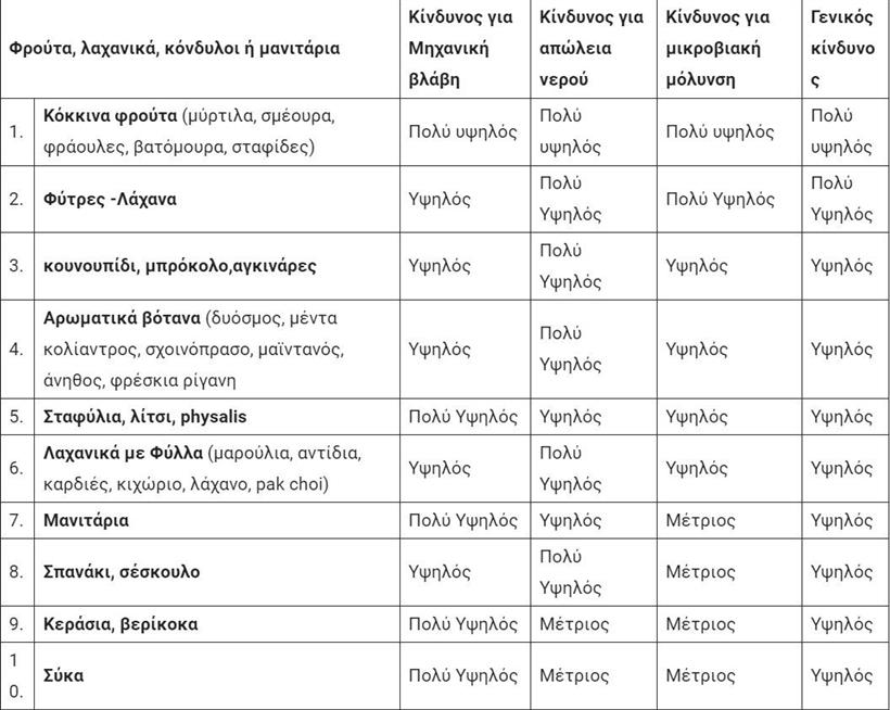 Ακολουθεί η λίστα με φρούτα, λαχανικά και μανιτάρια με τη συνολική εκτίμηση κινδύνου που κατηγοριοποιείται όσον αφορά στην πιθανότητα «μηχανικής βλάβης», απώλειας νερού και αλλοίωσης ή παθογόνων μικροοργανισμών και που ίσως χρειάζεται να αγοράζονται συσκευασμένα. Να σημειωθεί ότι στην περίπτωση των κονδύλων (πατάτες, γλυκοπατάτες κ.λπ.), συνάγεται το συμπέρασμα ότι δεν παρουσιάζουν σημαντικό κίνδυνο όταν πωλούνται χύμα.