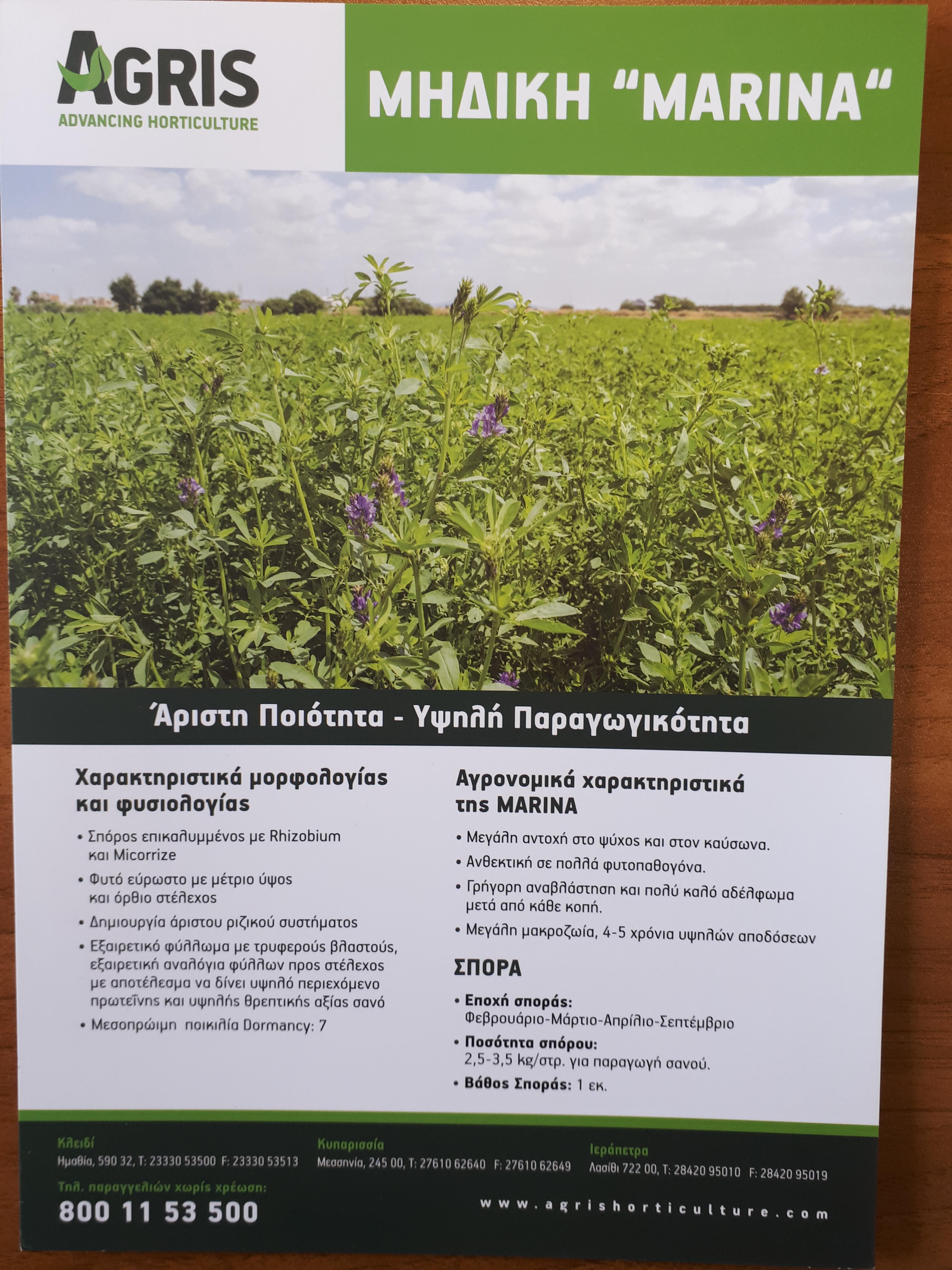 Η εταιρία AGRIS A.E εκτός των είδη καταξιωμένων ποικιλιών μηδικής LETIZIA και LODI, διαθέτει στη ελληνική αγορά δυο νέες Ιταλικές ποικιλίες την AZZURRA και την MARINA ,η τελευταία είναι μηδική με σπόρο επικαλυμμένο με Rhizobium και Micorrize.