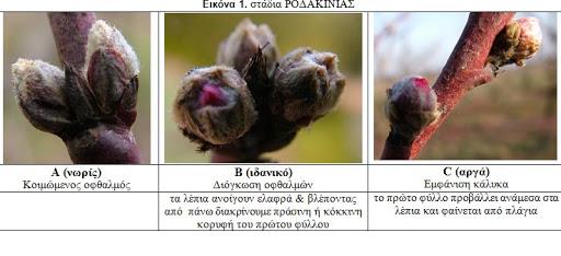 • Σε ορισμένες περιοχές, κυρίως στο νομό Πέλλας, εντοπίστηκαν υπερπρώιμες ποικιλίες, σε μικρό ποσοστό, να βρίσκονται στην έναρξη του σταδίου C (εικόνα 1.), ενώ στις περισσότερες περιοχές οι ποικιλίες βρίσκονται στο στάδιο της διόγκωσης των οφθαλμών (εικόνα 2.).