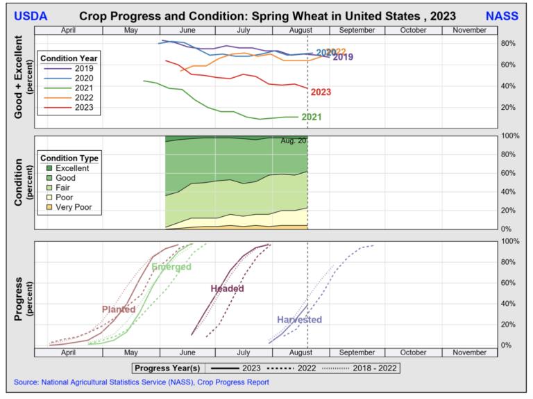 "Η έκθεση έδειξε ότι οι αξιολογήσεις καλής έως εξαιρετικής ποιότητας για την καλλιέργεια ανοιξιάτικου σιταριού μειώθηκαν κατά 4 ποσοστιαίες μονάδες στο 38% καλής έως εξαιρετικής ποιότητας την εβδομάδα που έληξε στις 20 Αυγούστου".