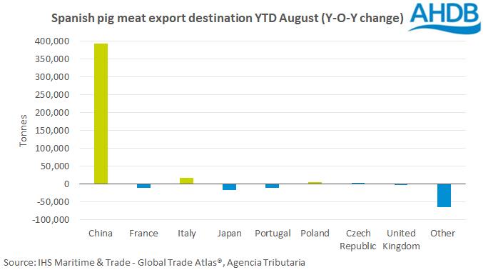 726.000 τόνοι εστάλησαν στην Κίνα, η οποία είναι τώρα η μεγαλύτερη αγορά ισπανικού χοιρινού κρέατος, αντιπροσωπεύοντας το 42% των όγκων που εξήχθησαν. H εικόνα που διαμορφώνεται είναι εντελώς διαφορετική από την ίδια περίοδο πέρυσι, όταν το χοιρινό που εξήχθη στην Κίνα αντιπροσώπευε το 23% και θα μπορούσε να αλλάξει γρήγορα καθώς το γερμανικό χοιρινό έχει χάσει την πρόσβαση στην κινεζική αγορά τον Σεπτέμβριο.