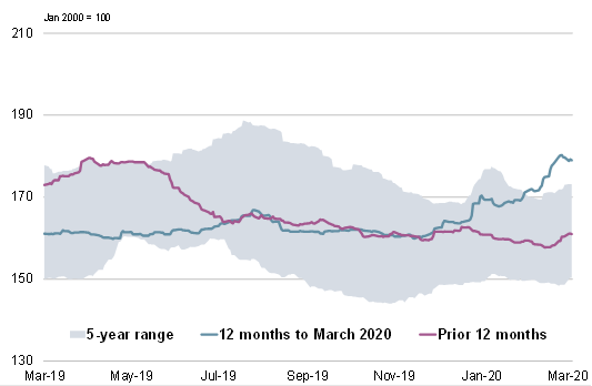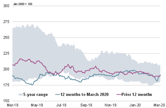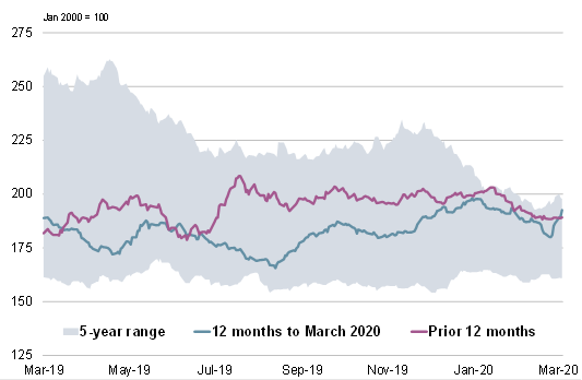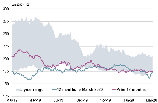 Με ευρείες αντισταθμίσεις στις κύριες συνιστώσες, η GOI της IGC παρέμεινε σχεδόν αμετάβλητη σε σύγκριση με το Φεβρουάριο GMR.