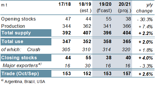 Στο επίκεντρο της πτώσης της αμερικανικής παραγωγής, η παγκόσμια παραγωγή σόγιας το 2019/20 παρατηρείται πτώση κατά 21 εκατ. Τόνους / έτος, στα 341 μέτρα. Με την αναμενόμενη κατανάλωση σε μια νέα αιχμή, τα αποθέματα αναμένεται να συσφίγγονται απότομα καθώς τα αποθέματα των ΗΠΑ υπερβαίνουν κατά το ήμισυ. Οι μεγαλύτερες παραδόσεις στην Ασία θα μπορούσαν να ενισχύσουν το 1% του ετήσιου κέρδους στο παγκόσμιο εμπόριο. Σε σχέση με μια πιθανή ανάκαμψη στις ΗΠΑ, η παγκόσμια παραγωγή το 2020/21 προβλέπεται να ανέλθει σε 366 εκατ. Τόνους, αυξημένη κατά 7% ετησίως. Με μια μικρή αύξηση της αναμενόμενης κατανάλωσης, τα αποθέματα είναι πιθανό να παραμείνουν κάτω από τον πρόσφατο μέσο όρο. Η παγκόσμια ζήτηση για εισαγωγές προβλέπεται ότι θα αυξηθεί στα 157 εκατ. Τόνους.
