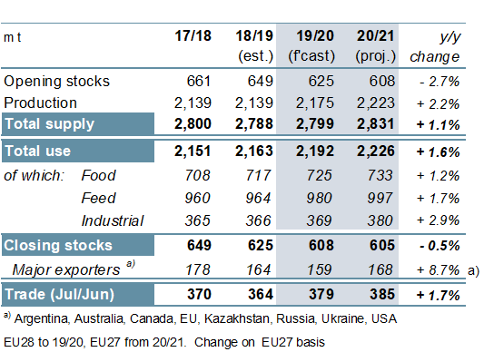 Σε2.799 τόνους, οι παγκόσμιες συνολικές ποσότητες σιτηρών (σιτάρι και χονδρά σιτηρά) που προμηθεύονται το 2019/20 προβλέπεται να είναι ελαφρώς υψηλότερες σε ετήσια βάση και μόνο κλασματικά μικρότερες από την αιχμή όλων των εποχών πριν από δύο εποχές, καθώς η αυξημένη παραγωγή δεν αντισταθμίζει την αυστηρότερη μεταφορά -σε αποθέματα. Με τη ζήτηση που κατέβαλε σε ρεκόρ και ξεπερνώντας το μικρό κέρδος εφοδιασμού, τα αποθέματα που τελειώνουν φαίνεται να συρρικνώνονται σε ένα τετραετές χαμηλό, σχεδόν εξ ολοκλήρου λόγω της άντλησης καλαμποκιού, ιδιαίτερα στην Κίνα. Το εμπόριο συνδέεται με νέο υψηλό επίπεδο, συμπεριλαμβανομένων μεγαλύτερων αποστολών σιταριού, αραβοσίτου, κριθαριού και σόργου.