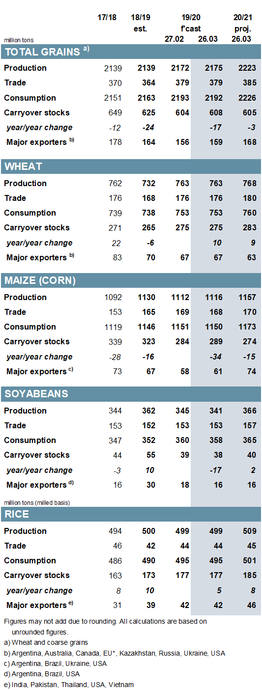 Το 2020/21, η παγκόσμια συνολική παραγωγή σιτηρών προβλέπεται να αυξηθεί στα 2.223 εκατ. Τόνους, αυξημένη κατά 2% ετησίως και σε υψηλό επίπεδο όλων των εποχών. Σε αυτό το επίπεδο, η συνολική προσφορά θα είναι μια νέα αιχμή, αλλά με την υποτιθέμενη αύξηση της κατανάλωσης, προβλέπεται μια μικρή μείωση των αποθεμάτων που τελειώνουν. Για άλλη μια φορά, αυτό συνδέεται κυρίως με την πτώση των αποθεμάτων αραβοσίτου στην Κίνα, η οποία υπεραντισταθμίζει τη συσσώρευση των σιτηρών αυτών στις ΗΠΑ. Τα αποθέματα σίτου προβλέπεται να είναι σε υψηλό επίπεδο, με εξέλιξη την Κίνα και την Ινδία. Προβλέπεται αύξηση κατά 2% για το συνολικό εμπόριο σιτηρών, με επιτάχυνση των μεταφορών αραβοσίτου, σίτου και σόργου.
