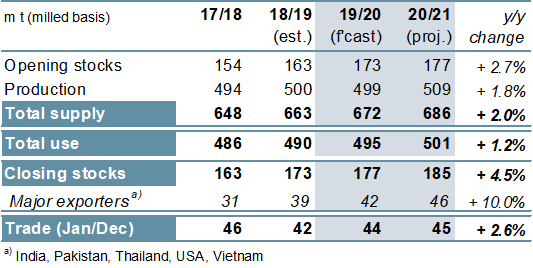 Με την παραγωγή ρεκόρ στην Ινδία, η οποία αντισταθμίζει κατά κύριο λόγο την πτώση σε άλλα μέρη, συμπεριλαμβανομένης της Κίνας, της Ταϊλάνδης και των ΗΠΑ, η παγκόσμια παραγωγή ρυζιού το 2019/20 παρατηρείται μικρή αλλαγή, φθάνοντας τα 499 εκατομμύρια τόνους. Η κατανάλωση αναμένεται να επεκταθεί στην αύξηση του πληθυσμού, καθώς το εμπόριο αυξάνεται κατά την αγορά από τους εισαγωγείς στην Αφρική. Το 2020/21, τα περιθώρια κέρδους στην Ασία φαίνεται ότι στηρίζουν αύξηση της παραγωγής κατά 2% στα 509 εκατ. Τόνους, με συνολική χρήση σε νέο υψηλό επίπεδο. Τα αποθέματα αναμένεται να επεκταθούν σε ένα ρεκόρ ύψους 185 εκατομμυρίων τόνων στη συσσώρευση στην Κίνα και την Ινδία. Το παγκόσμιο εμπόριο θα μπορούσε να ανέλθει σε τριετή αιχμή στις αφρικανικές ανάγκες.