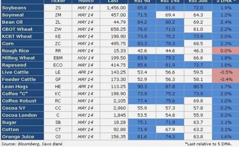 Όσον αφορά τον αριθμό περιόδων του δείκτη, η πιο διαδομένη διάρκεια είναι οι 14 ημέρες. Όπως μπορείτε να δείτε και στον παρακάτω πίνακα, η πλειονότητα των γεωργικών εμπορευμάτων βρίσκεται στα επίπεδα υπέρ-αγορασμένης αγοράς, σύμφωνα πάντα με το δείκτη σχετικής δύναμης, αποτελώντας κατ’ επέκταση περιορισμό για την περεταίρω άνοδο των τιμών.