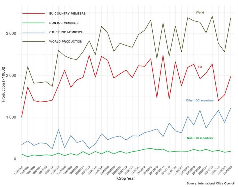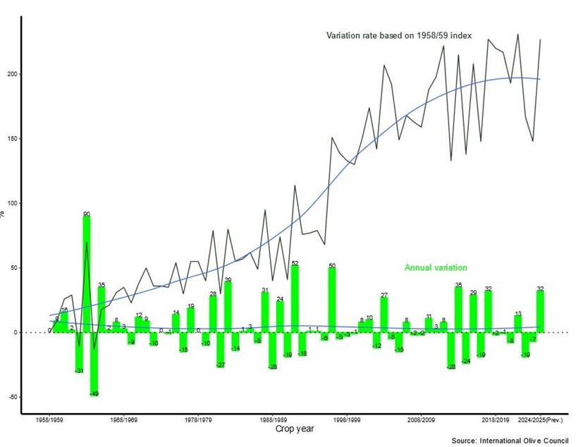Η παραγωγή ελαιολάδου έχει τριπλασιαστεί τα τελευταία 60 χρόνια, φθάνοντας τους 2.760.000 τόνους την τελευταία καλλιεργητική περίοδο (2022/23), σύμφωνα με το Διεθνές Συμβούλιο Ελαιολάδου (IOC). Τα προσωρινά στοιχεία για την καλλιεργητική περίοδο 2023/24 δείχνουν μείωση της παραγωγής κατά 7%, σε 2.564.000 τόνους, ενώ η εκτίμηση για την καλλιεργητική περίοδο 2024/25 δείχνει ότι η παραγωγή θα φθάσει τους 3.375.500 τόνους (+32%).