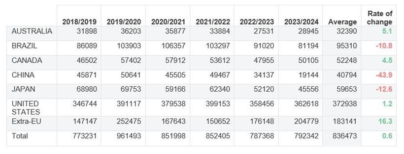 Οι εισαγωγές ελαιολάδου από τις κύριες αγορές (βλ. πίνακα παρακάτω) αυξήθηκαν κατά 0,6% μεταξύ Οκτωβρίου 2023 και Σεπτεμβρίου 2024 σε σύγκριση με την ίδια περίοδο του καλλιεργητικού έτους 2022/2023.