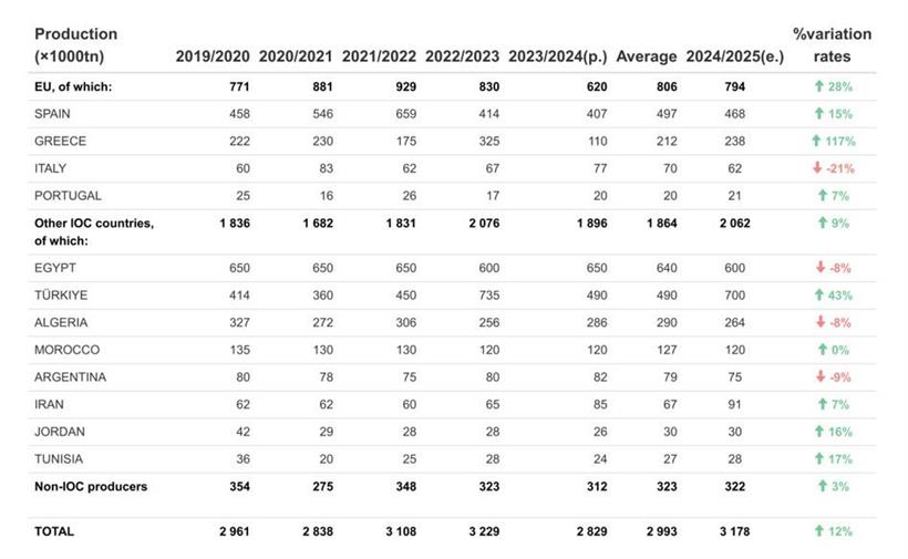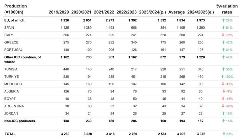 Οι χώρες μέλη του ICO στο σύνολό τους προβλέπεται να παράγουν 3.193.000 τόνους, ή το 95% του παγκόσμιου συνόλου το 2024/25, σημειώνοντας αύξηση 33% σε σχέση με το προηγούμενο καλλιεργητικό έτος. Οι χώρες παραγωγής της ΕΕ στο σύνολό τους προβλέπουν παραγωγή 1.973.000 τόνων, δηλαδή αύξηση 29%. Οι υπόλοιπες χώρες μέλη του ICO αναμένεται να παράγουν συνολικά 1.220.000 τόνους (+ 40%).