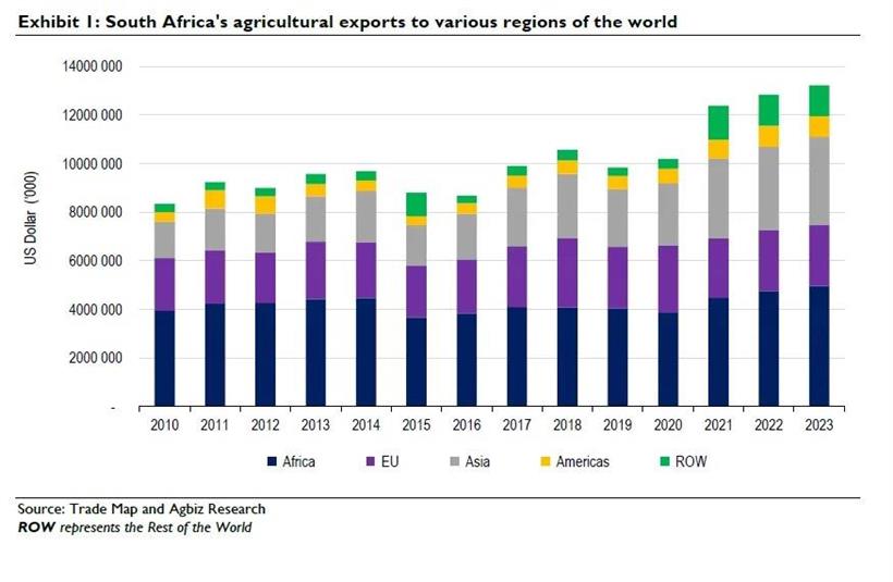 Το 2023, η Νότια Αφρική κατέγραψε εξαγωγές γεωργικών προϊόντων αξίας 13,2 δισεκατομμυρίων δολαρίων, με σημαντική συνεισφορά από προϊόντα υψηλής αξίας, όπως εσπεριδοειδή, χυμοί φρούτων, κρασί, χουρμάδες, ξηροί καρποί, μήλα, αχλάδια και κομμένα άνθη.