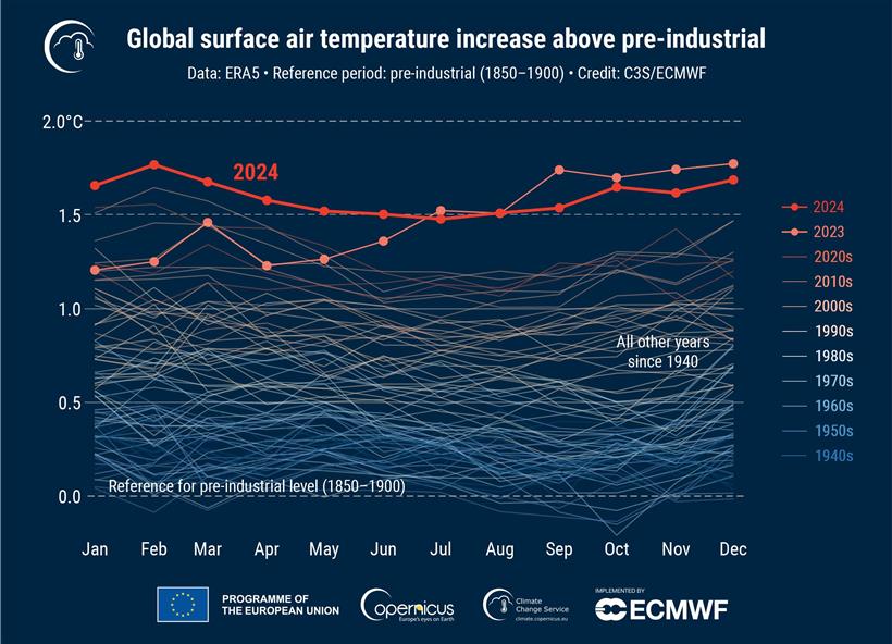 Έχοντας πλέον συλλέξει και επεξεργαστεί όλα τα δεδομένα, η αρμόδια υπηρεσία της Ευρωπαϊκής Ένωσης, Copernicus Climate Change Service (C3S), δημοσίευσε σήμερα την κλιματική αποτίμηση της ιστορικής, όπως αποδείχτηκε, περασμένης χρονιάς. Παρακάτω παραθέτουμε τα σημεία-κλειδιά για το κλίμα του 2024 στον πλανήτη.