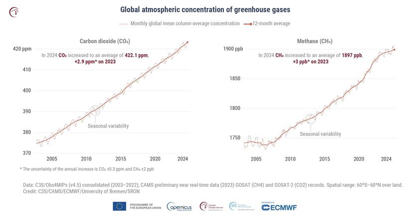 * Οι συγκεντρώσεις διοξειδίου του άνθρακα και μεθανίου συνέχισαν την σταθερά ανοδική τάση και το 2024, φτάνοντας τα επίπεδα 422 ppm και 1897 ppb, αντίστοιχα. Λαμβάνοντας υπόψη παλεοκλιματικές εκτιμήσεις, αυτές οι τιμές αποτελούν ρεκόρ τουλάχιστον 2.000.000 και 800.000 ετών, αντίστοιχα.