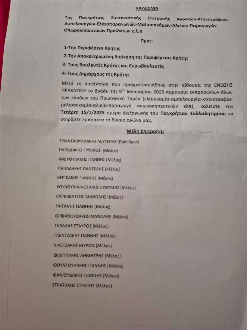 Σχετικά με το Παγκρήτιο αγροτικό συλλαλητήριο που πραγματοποιήθηκε στο Ηράκλειο την 15 Ιανουαρίου 2025 αναφέρουμε τα παρακάτω. :
