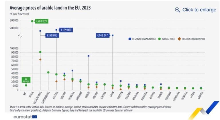 Μεταξύ των 22 χωρών της ΕΕ με διαθέσιμα στοιχεία, η μακράν υψηλότερη μέση τιμή για ένα εκτάριο αρόσιμης γης καταγράφηκε στη Μάλτα με 283.039 ευρώ ανά εκτάριο. Η αμέσως επόμενη υψηλότερη μέση τιμή καταγράφηκε στην Ολλανδία με 91.154 ευρώ ανά εκτάριο, ακολουθούμενη από το Λουξεμβούργο με 42.540 ευρώ ανά εκτάριο.
