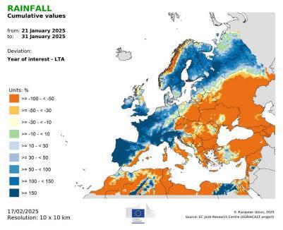 Τον Ιανουάριο, έντονες βροχοπτώσεις έπληξαν τη βορειοδυτική Γαλλία. Παρόλο που η βροχόπτωση δεν ήταν ασυνήθιστη αν εξεταστεί συνολικά για την περίοδο αναφοράς, αυτό, σε συνδυασμό με τα ήδη υψηλά επίπεδα εδαφικής υγρασίας και τις σχετικά χαμηλές θερμοκρασίες, δημιούργησε δυσμενείς συνθήκες για την ανάπτυξη των καλλιεργειών.