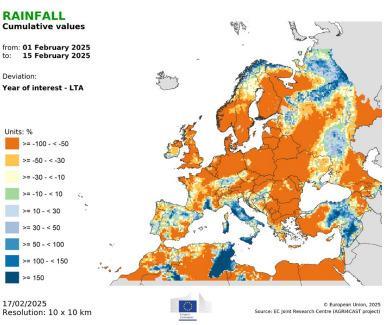 Ποσότητα βροχόπτωσης από 1 έως 15 Φεβρουαρίου, σε % του μακροχρόνιου κανόνα