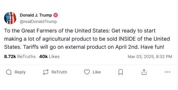 «Στους σπουδαίους αγρότες των ΗΠΑ: Ετοιμαστείτε να παράγετε πολλά αγροτικά προϊόντα για πώληση εντός των Ηνωμένων Πολιτειών. Οι δασμοί στα εξωτερικά προϊόντα ξεκινούν στις 2 Απριλίου. Καλή διασκέδαση!».