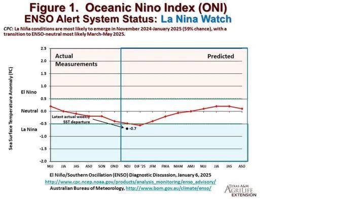 Η επίσημη πρόβλεψη για τον Ιανουάριο από το Κέντρο Πρόβλεψης Κλίματος των ΗΠΑ έχει ως εξής: «Οι συνθήκες La Niña είναι παρούσες και αναμένεται να διατηρηθούν μέχρι τον Φεβρουάριο-Απρίλιο του 2025 (59% πιθανότητα), με πιθανή μετάβαση σε ουδέτερη ENSO κατά τη διάρκεια του Μαρτίου-Μαΐου του 2025 (60% πιθανότητα)».