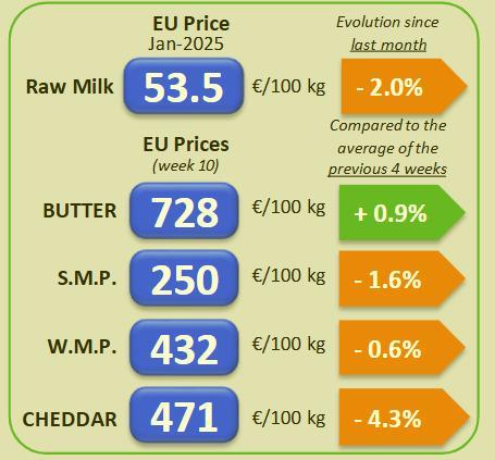 Σύμφωνα με τα στοιχεία που συνέταξε η Διεύθυνση Γεωργίας και Αγροτικής Ανάπτυξης της Ευρωπαϊκής Επιτροπής, η μέση τιμή του γάλακτος στην πύλη του αγροκτήματος της ΕΕ ήταν 53,5 c/kg τον Ιανουάριο.