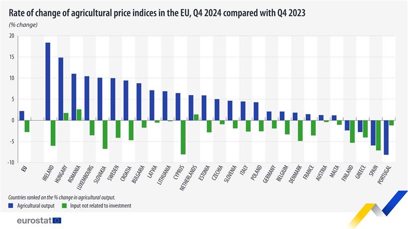 Οι μεγαλύτερες αυξήσεις στην αξία της αγροτικής παραγωγής παρατηρήθηκαν στην Ιρλανδία (+18,4%), την Ουγγαρία (+14,9%) και τη Ρουμανία (+11,0%), αναδεικνύοντας διαφορετικές δυναμικές στις εθνικές αγορές της ΕΕ. Ωστόσο, χώρες όπως η Πορτογαλία (-8,1%), η Ισπανία (-5,9%), η Ελλάδα (-2,8%) και η Φινλανδία (-2,4%) είδαν τις τιμές των προϊόντων τους να μειώνονται, γεγονός που υπογραμμίζει τις άνισες συνθήκες που επικρατούν σε επιμέρους περιοχές.