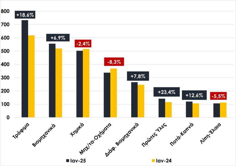 Αναλύοντας τις εξαγωγικές επιδόσεις ανά κλάδο, παρατηρείται σημαντική αύξηση στον κλάδο των τροφίμων κατά €115,1 εκατ ή 18,6%. σε σύγκριση με την αντίστοιχη περσινή περίοδο καθώς επίσης αύξηση παρατηρούμαι στον κλάδο των βιομηχανικών προϊόντων κατά €35,8 εκατ ή 6,9%.
