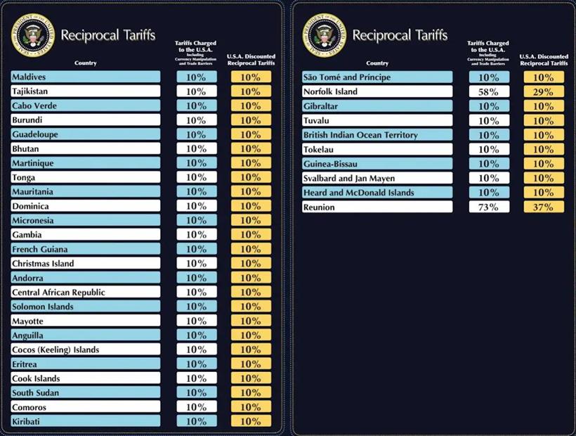 Οι επιπρόσθετοι δασμοί αυτοί υποτίθεται πως αποτελούν ανταπόδοση για «μη δασμολογικούς» φραγμούς για τα αμερικανικά προϊόντα, για παράδειγμα υγειονομικούς και περιβαλλοντικούς κανονισμούς. Ο Ντόναλντ Τραμπ περιέγραψε τα μέτρα αυτά με την έκφραση «πολύ ευγενικά».