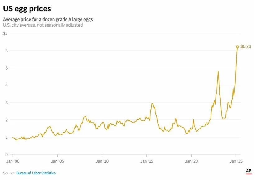 Οι τιμές των αυγών είχαν φτάσει τα 5,90 δολάρια τον Φεβρουάριο, έναν μήνα μετά το ρεκόρ των 4,95 δολαρίων ανά δωδεκάδα, σύμφωνα με την αμερικανική στατιστική Αρχή.