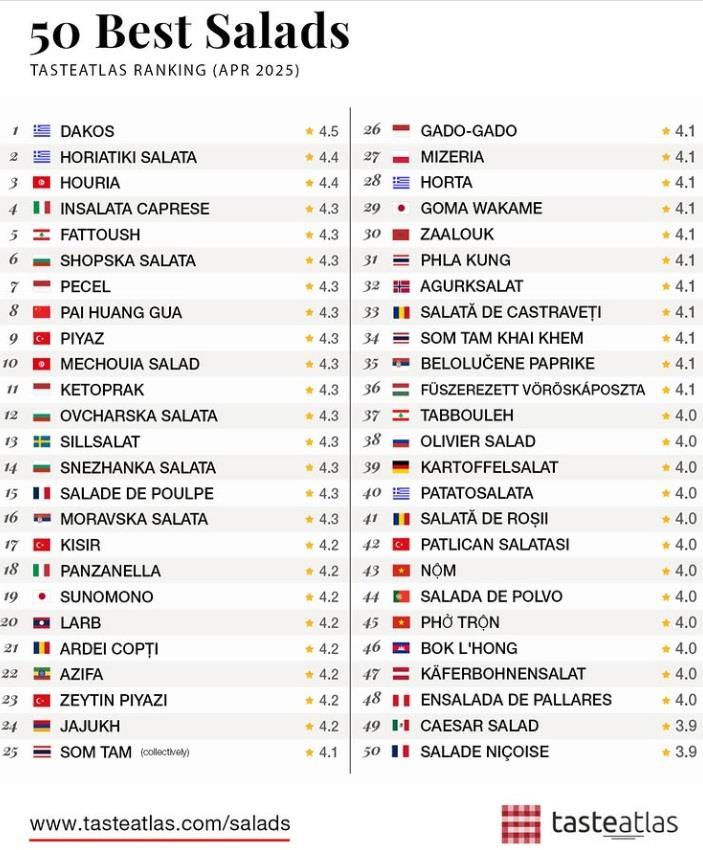 Ο πλήρης κατάλογος με τις 50 κορυφαίες σαλάτες παγκοσμίως βρίσκεται διαθέσιμος στην ιστοσελίδα του Taste Atlas.