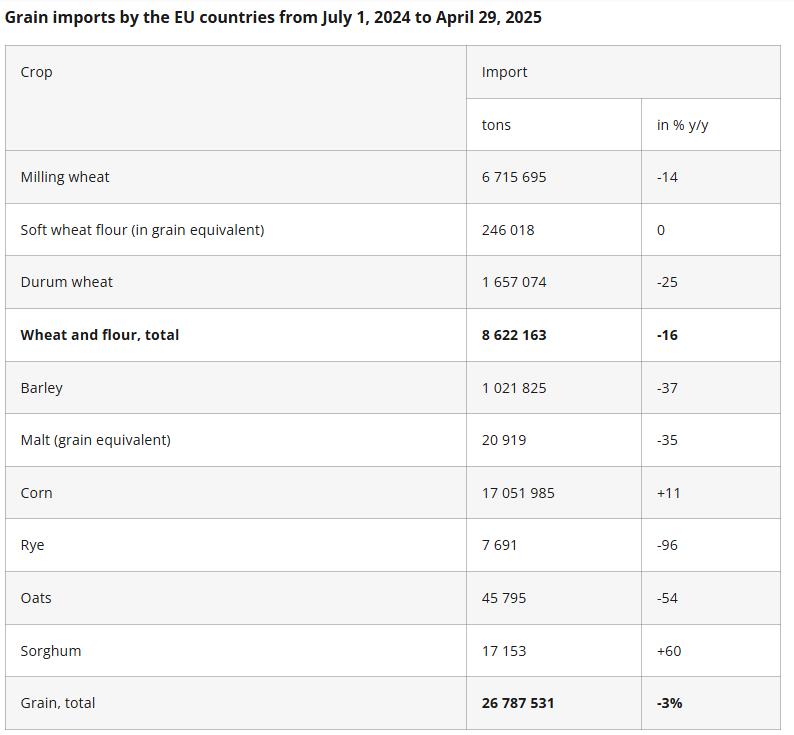 Κατά την τρέχουσα περίοδο, η ΕΕ εισάγει μαλακό σιτάρι και καλαμπόκι κυρίως από την Ουκρανία. Από τον Ιούλιο του 2024 έως τον Απρίλιο του 2025, η Ουκρανία προμήθευσε την ΕΕ με 4274,4 χιλιάδες τόνους μαλακού σίτου και 9712,4 χιλιάδες τόνους καλαμποκιού.
