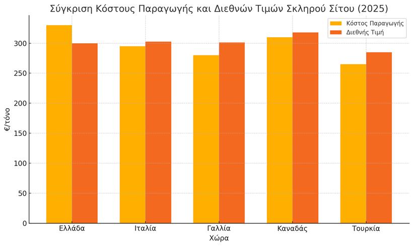 Παρακάτω παρουσιάζεται η σύγκριση του κόστους παραγωγής και της διεθνούς τιμής ανά χώρα για το 2025.