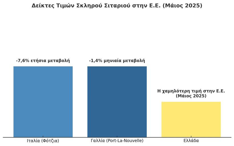 Η Ελλάδα, αν και διατηρεί εξαγωγικό προσανατολισμό, καταγράφει τον χαμηλότερο δείκτη τιμών σκληρού σιταριού στην Ε.Ε. (30,37 βάσει του Ευρωπαϊκού Δείκτη Τιμών). Οι εγχώριες τιμές παραγωγού διαμορφώνονται σημαντικά κάτω από τα 300 €/τόνο, με πρόσφατα στοιχεία να καταγράφουν αποτιμήσεις κοντά στα 270–280 €/τόνο.