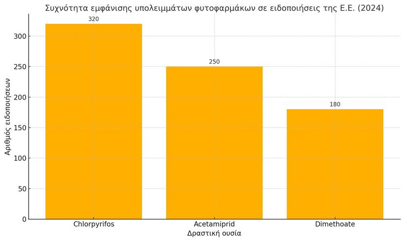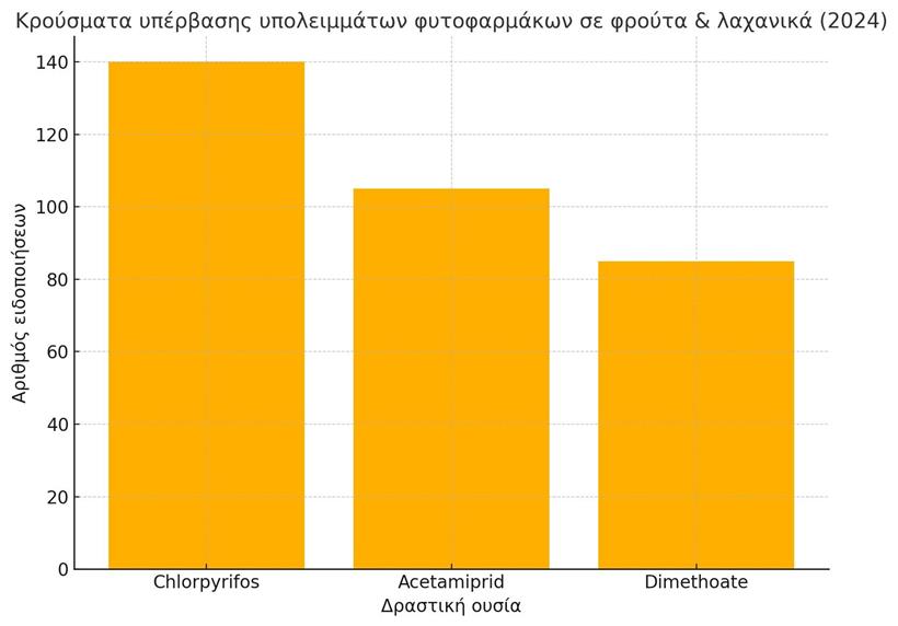 Στο επίκεντρο των ανησυχιών βρίσκονται τα φρούτα και λαχανικά, τα οποία συγκέντρωσαν 1.479 ειδοποιήσεις, καθιστώντας τα την πιο συχνά αναφερόμενη κατηγορία. Οι περισσότερες περιπτώσεις αφορούν υπερβάσεις φυτοφαρμάκων, με προϊόντα από Τουρκία, Αίγυπτο και Ινδία να πρωταγωνιστούν. Οι δραστικές ουσίες chlorpyrifos, acetamiprid και dimethoate εντοπίστηκαν με συχνότητα, ενώ χαρακτηριστικό είναι το γεγονός ότι εντοπίστηκαν περισσότερα από 10 διαφορετικά φυτοφάρμακα σε πολλά προϊόντα.