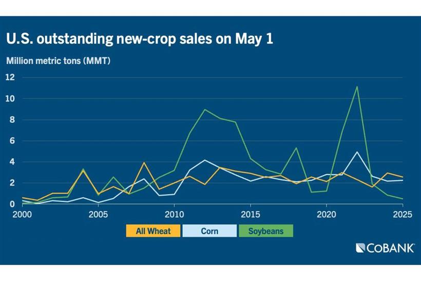 Η συνεχιζόμενη αβεβαιότητα γύρω από τις εμπορικές πολιτικές των Ηνωμένων Πολιτειών επηρεάζει περισσότερο τις πωλήσεις της νέας σοδειάς καλαμποκιού και σόγιας, οδηγώντας τες σε επίπεδα σημαντικά χαμηλότερα από τους ιστορικούς μέσους όρους, σύμφωνα με νέα έκθεση του Knowledge Exchange της CoBank.